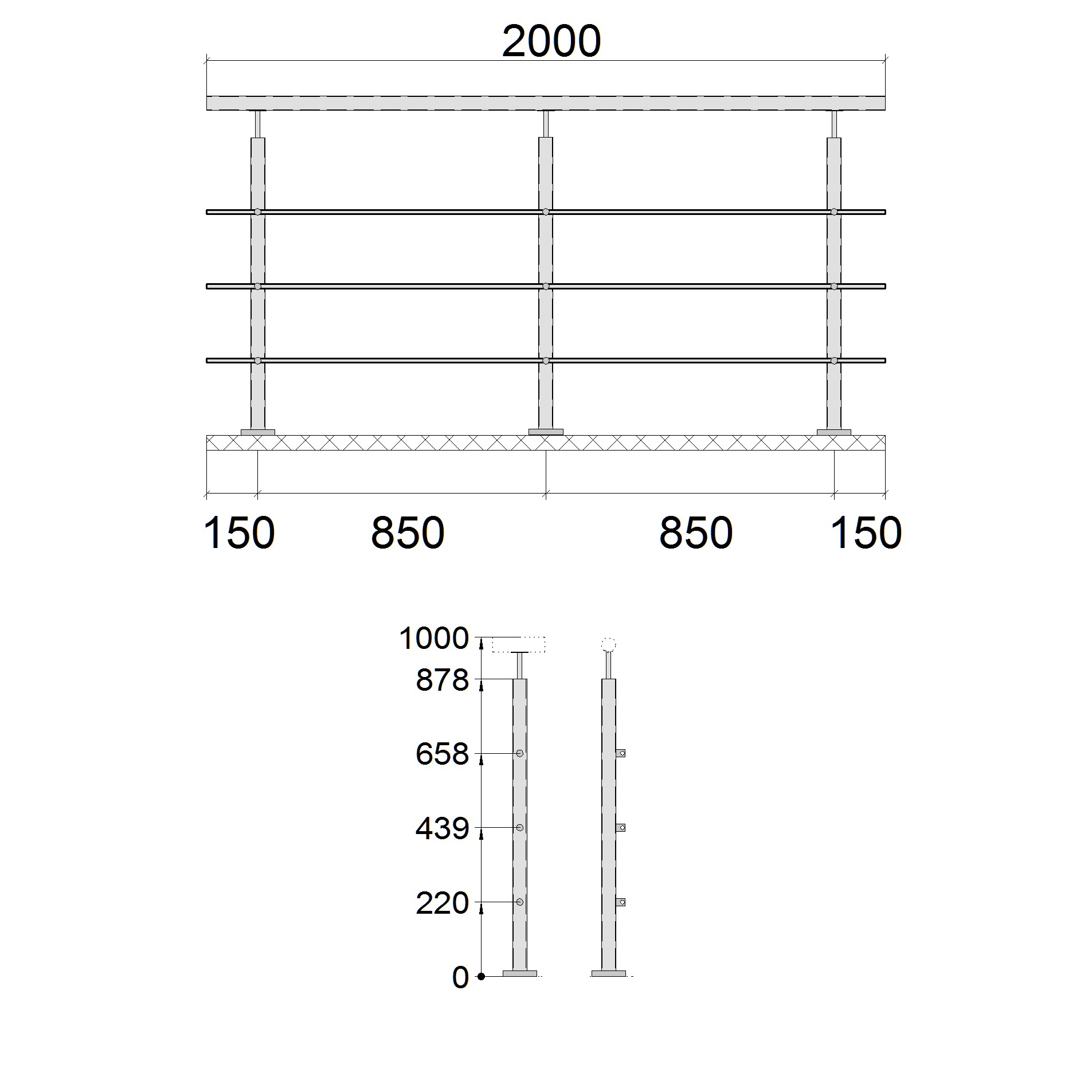 Edelstahlgeländer mit 3 waagerechten Füllstäben für die aufseitige Montage. Das Geländer ist 2m breit und 1m hoch und hat 3 Pfosten. Die Füllstäbe sind vor den Pfosten angebracht und bieten keinen Überkletterungsschutz. Die Füllstäbe haben einen max. Abstand von 12 cm.
